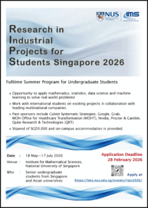 The Research in Industrial Projects for Students Program in Singapore (RIPS-SG) is run by the Institute for Mathematical Sciences (IMS) in collaboration with IPAM/UCLA and provides an opportunity for talented undergraduate students to work in international teams on a real-world research project proposed by sponsors. The student team, with support from their academic mentor and industry mentor, will research the problem and present their results, both orally and in writing, at the end of the program.
